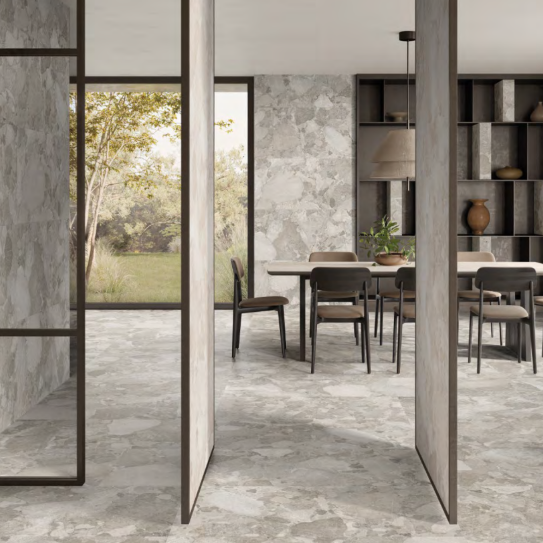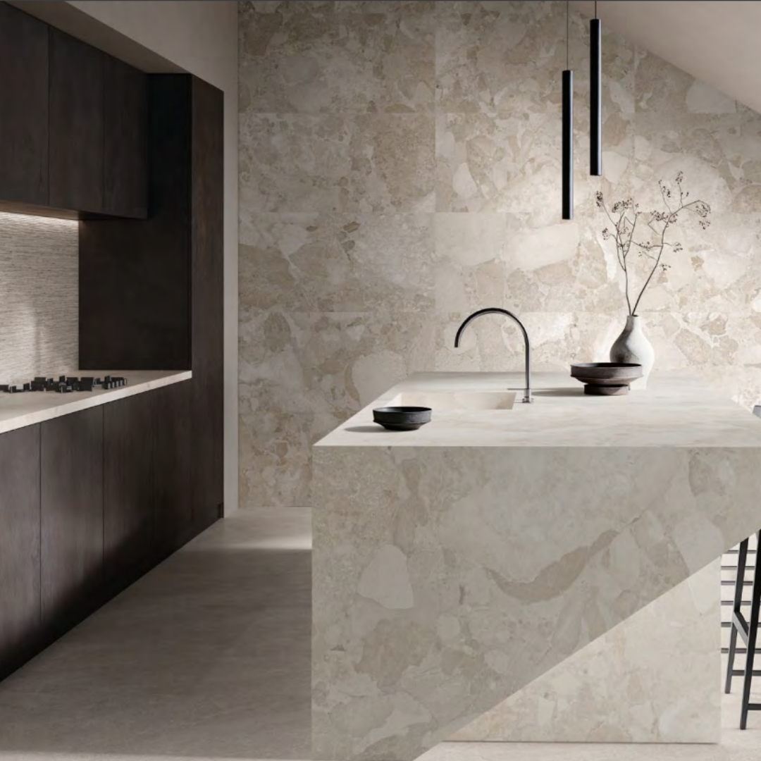 Matera Stone by Ergon unites timeless natural beauty with advanced technology, offering versatile surfaces for sophisticated contemporary spaces.
